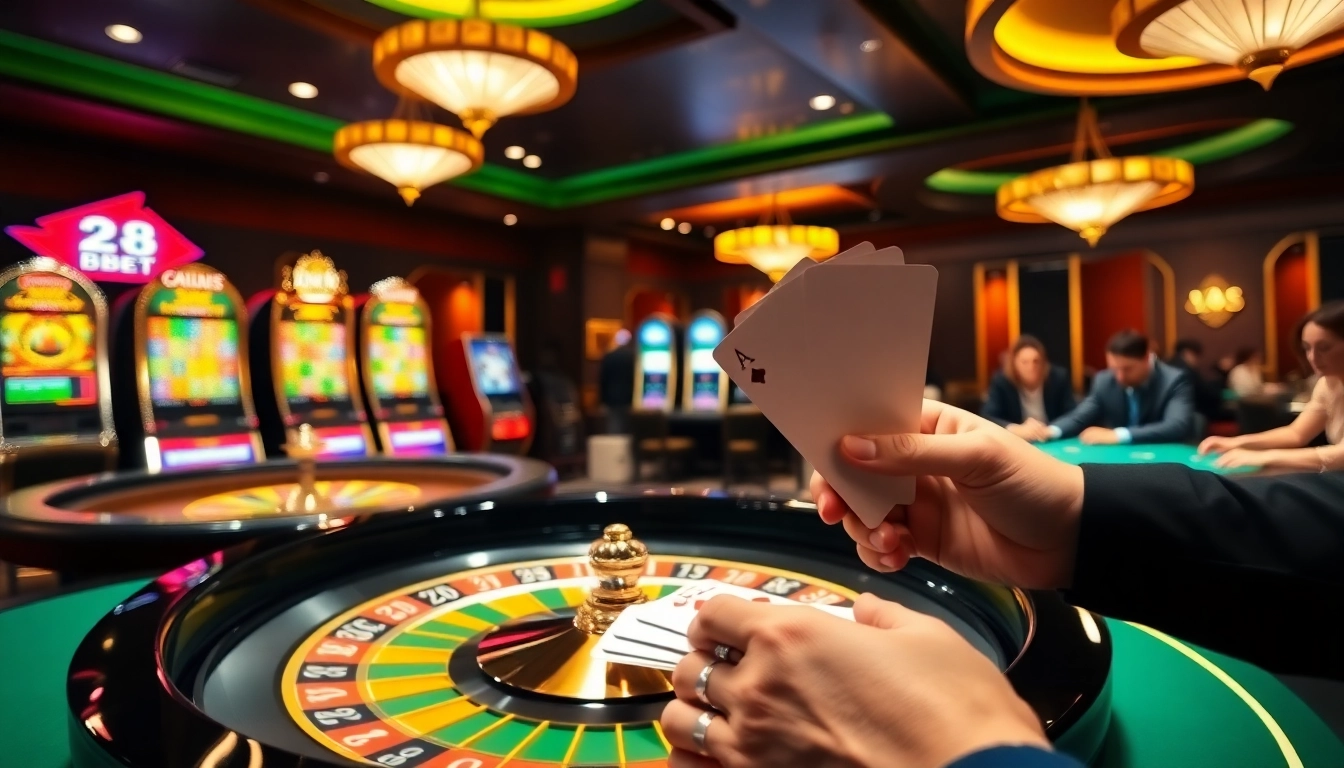 Bet big at 28BET with a thrilling casino scene featuring roulette, chips, and cards.