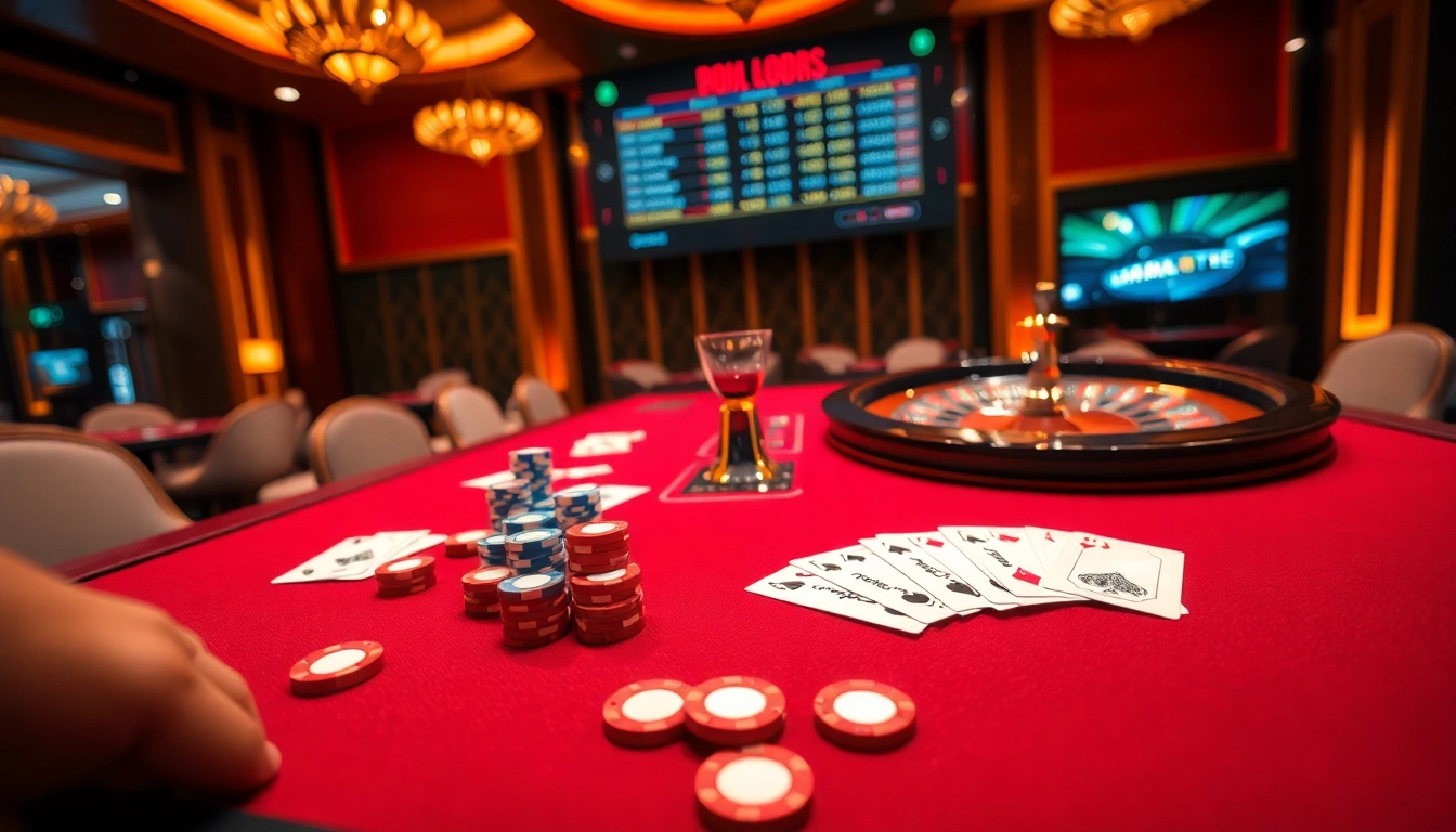 Engaging with kèo nhà cái at a luxurious casino table filled with cards and betting slips.