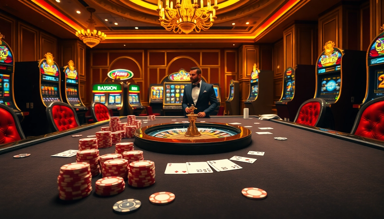 Experience thrilling casino action at 789p with vibrant poker chips and an elegantly set gaming table.