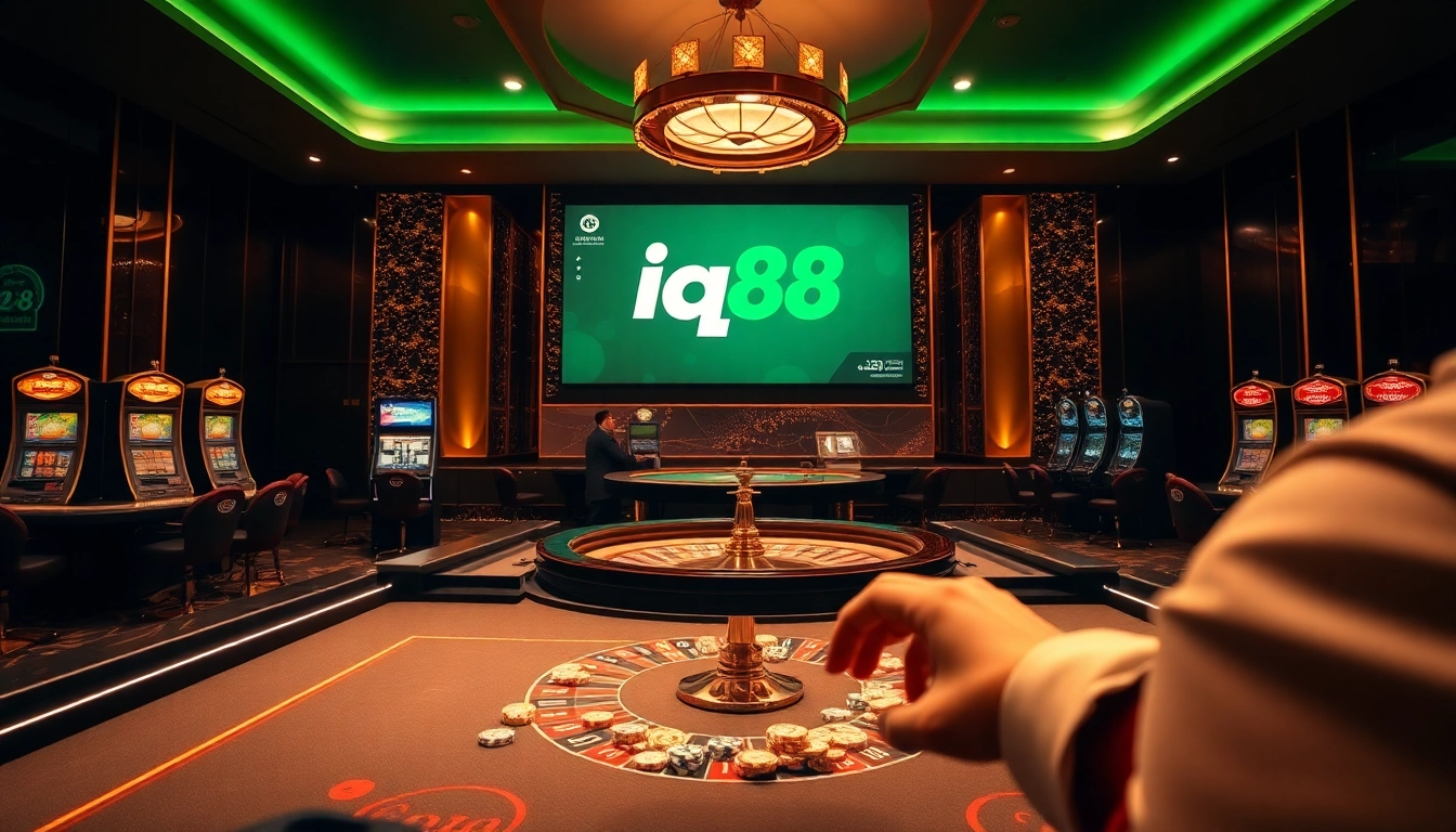 Experience high-stakes gaming at iq88 casino with vibrant tables, chips, and slot machines.