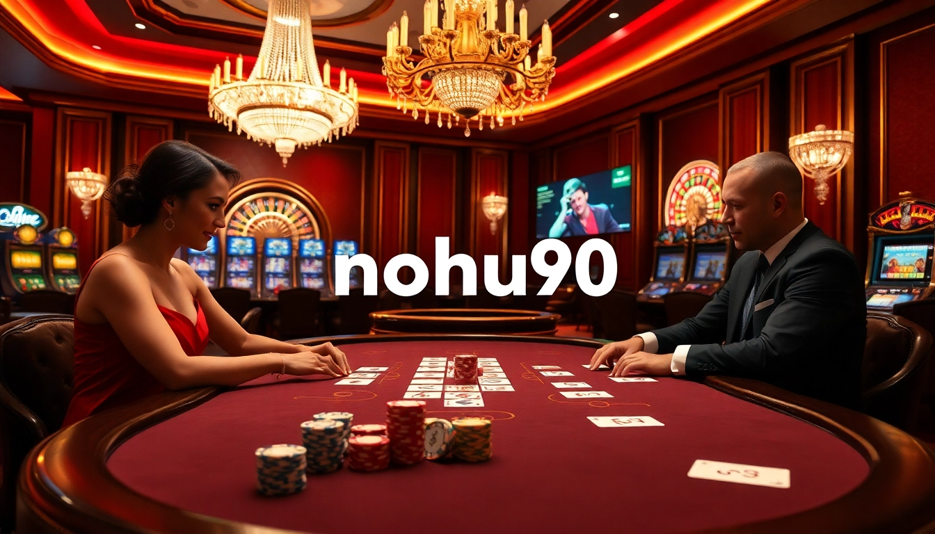 A vibrant casino scene with players at a poker table, featuring rich colors and nohu90 branding, conveying excitement and sophistication.
