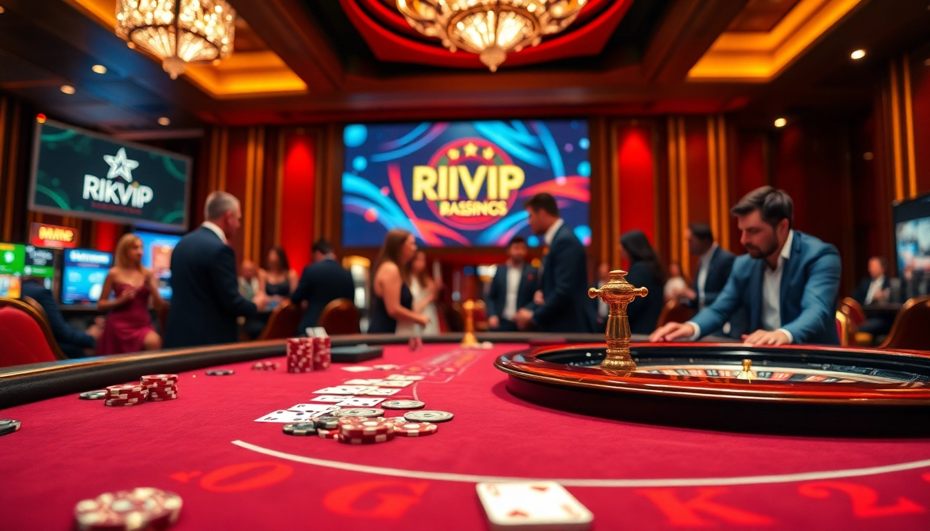 Players enjoying an exciting game at rikvip casino, showcasing a vibrant blackjack table and roulette wheel action.