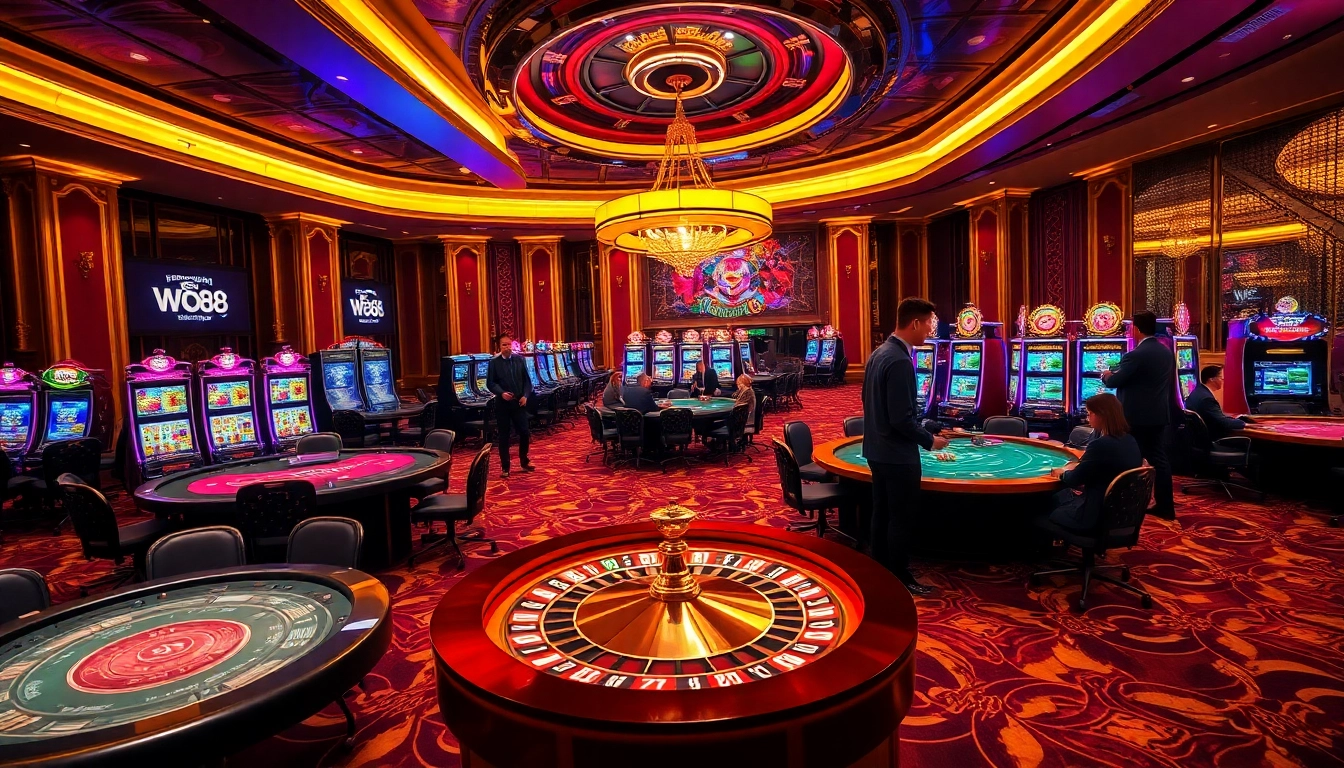 W88 casino scene featuring engaged players at poker tables and vibrant slot machines.