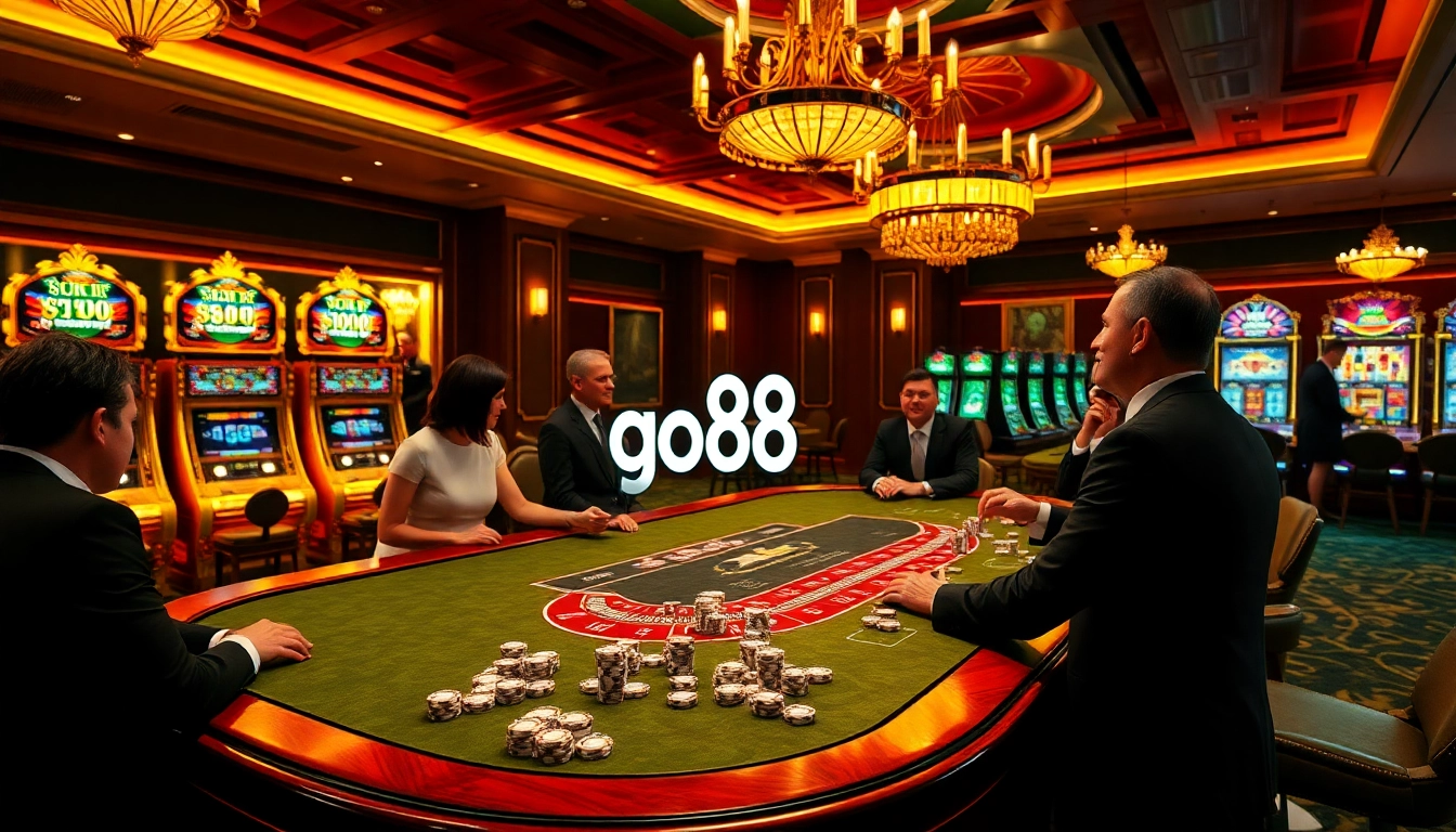 Engage with go88's thrilling gaming experience at a luxurious casino table with vibrant slot machines.
